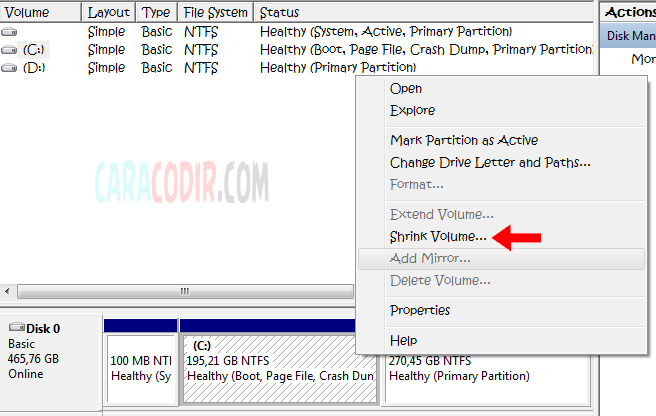 3. Pilih lokal disk yang akan di partisi, contohnya lokal disk c kemudian klik kanan dan pilih Shrink Volume.